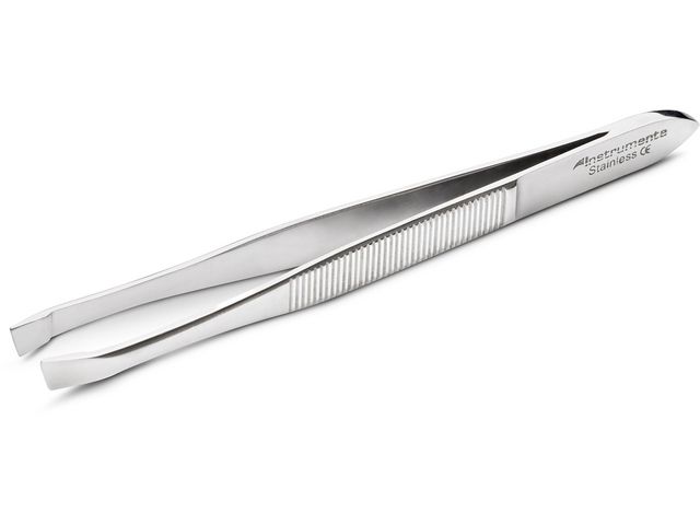Pincett av rostfritt stål, individuellt förpackad i plastpåse. Produkten är CE-märkt.