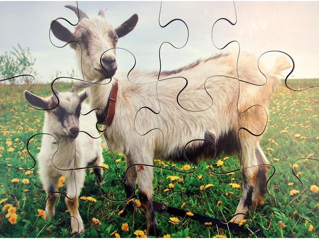 Sammanlagt är det 8 pussel med 12-18 bitar per pussel. Dessa pussel innehåller: Häst, ko, get, höna, får, anka, gris och hund.
