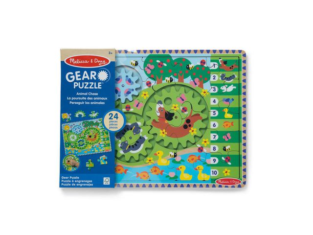 Sätt ihop ett träpussel med 24 bitar med djurtema och 4 sammankopplade kugghjul som snurrar. Det finns bilder på pusselbrädan under bitarna för enkel matchning. Innovativ design som är unik på marknaden - kugghjulsbitar passar över pinnar på pusselbrädet för att s kapa 3 kugghjul.