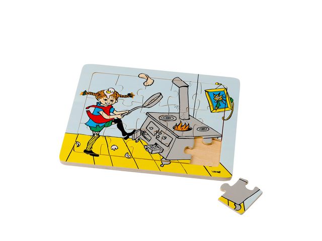 I det här rampusslet i trä får barnet hjälpa Pippi att laga sin favoritmåltid: Pannkakor. Setet innehåller 15 bitar. Pusslet läggs i sin ram vilket gör det lätt att lära sig var varje del hör hemma.