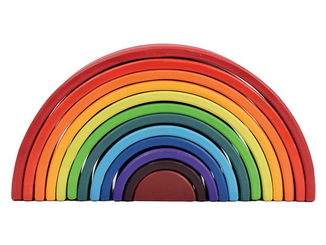 Byggset i trä där bitarna tillsammans skapar en vacker färgglad regnbåge. Bitarna kan användas som t.ex. tunnlar och broar tillsammans med andra typer av klossar. Stapla klossarna på varandra och sortera dem efter färg och storlek.