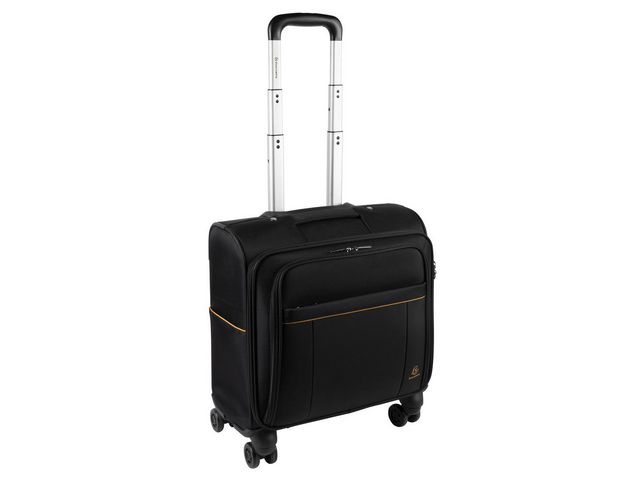Pilotväska med lätta och hållbara 4-vägs flervägshjul för bärbara datorer upp till 15,6 tum (36 x 27 x 4 cm), med infällbart teleskophandtag. Rymlig insida med korsband för enkel förvaring, separata quiltade fickor för dator och surfplatta. Bagaget kan säkras med det inbyggda TSA-låset. Stor framficka med dragkedja med många öppna eller stängda fack för surfplatta, telefon, pennor.Möjlighet att enkelt ladda en telefon eller surfplatta med USB-portar och integrerade kablar (2 USB-portar och 1 mikro-USB-port integrerad, laddare ingår ej) i väskan.