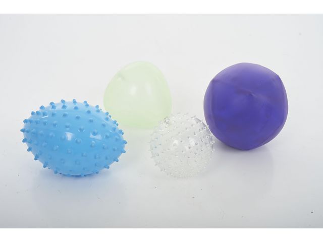 Ett set med fyra uppblåsbara bollar i distinkta och ovanliga former med olika ytstrukturer och färger. Passar bra för sensorisk stimulans, massage och motoriklek.