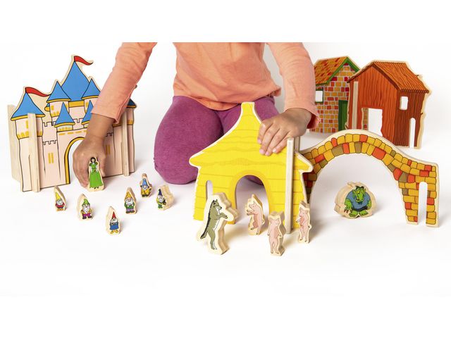 Skapar många timmar öppen lek och samtidigt lärande om tre av våra mest klassiska sagor. Innehåller husen och figurerna till sagorna Guldlock och de 3 björnarna, De 3 små grisarna, Snövit och Bockarna Bruse. Husen sätts enkelt ihop med varandra. 2 cm tjocka sagofigurer med tryck på bägge sidor. Komplettera gärna med sagofigurer.