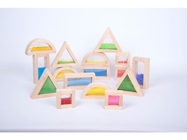 Rejäla klossar i lövträ som stimulerar barnens sinnen. Innehållande pärlor, färgad sand och vatten/glitter bakom transparent akrylglas i olika storlekar och färger. 4 olika former (kvadrat, rektangel, triangel och halvcirkel). Blocken främjar observation i ett vidare perspektiv. Alla former följer samma regler för färg och form.