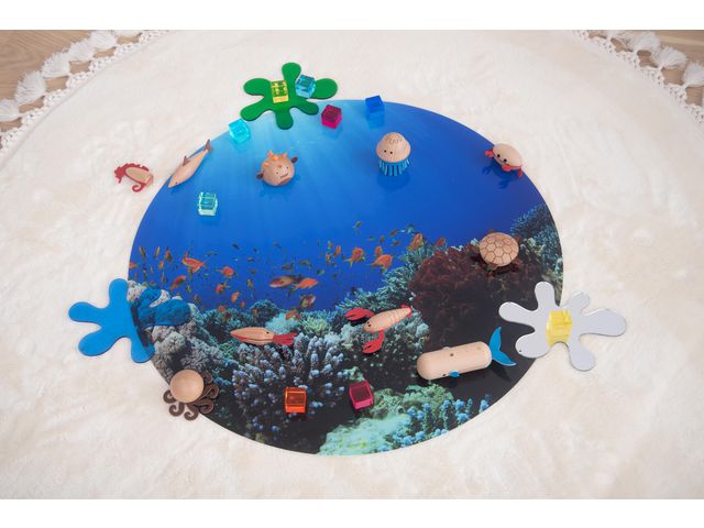 På grund av dess halvtransparenta egenskaper fungerar mattan speciellt bra på en ljuspanel eller stämningsbord eftersom ljuset kommer att lysa igenom, belysa fiskarna och korallen. Den valda färgkällan kommer att påverka mattans utseende på olika sätt: antingen genom att ändra vissa färger, intensifiera färgerna eller till och med få vissa färger att verka fluorescera - ett fascinerande sätt att utforska färg medan man leker. Stödjer följande inlärningsområden: