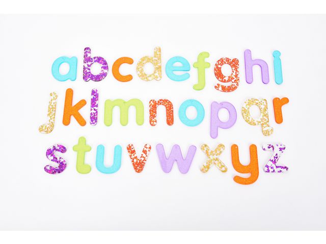 En uppsättning av 26 gnistrande glitter små bokstäver a-z i en barnvänlig font tillverkad av färgstark genomskinlig 3mm akryl.