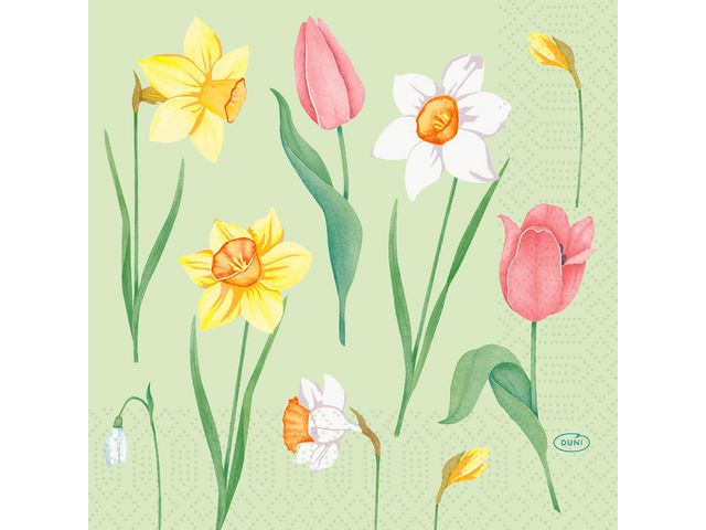 Servett med motiv av vårblommor på en ljusgrön botten.