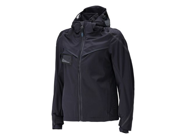 Jackan har andasfunktion och är både vind- och vattentät med tejpade sömmar för extra skydd. Stängningen består av en blixtlås och ett invändigt vindfång, medan den fodrade och löstagbara huvan har genomskinlig plast på sidorna. En hög krage och flera fickor, inklusive innerfickor och framfickor med blixtlås, ökar dess funktionalitet. Avtagbar ID-korthållare, ergonomiskt utformade ärmar för rörelsefrihet, resår i manschetten och ribbstickning vid handleden med tumhål ger extra komfort. Den förlängda ryggen med blixtlås invändigt gör det enkelt att lägga till tryck eller broderi. Reflexeffekter förbättrar synligheten och säkerheten.