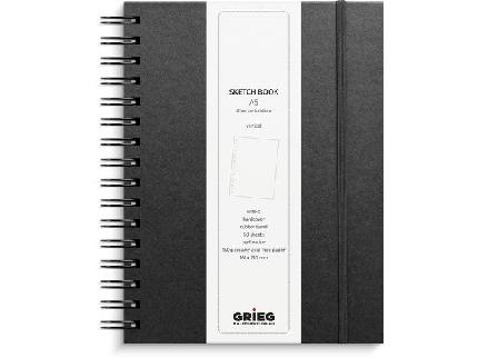 Skissblock Grieg. Spiralbunden med hårt omslag, och med gummibandsförsluting i svart som håller innehållet på plats. A5 stående, 150g syrafritt samt perforerat papper, 60 blad, olinjerat, svart.