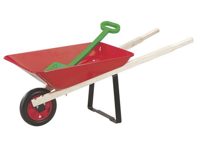 Den har även ett gummihjul och stödben som håller den stabil på stället ifall man behöver ställa ner den för en stund. Skottkärran har dessutom två trähandtag som ger ett bra grepp.
