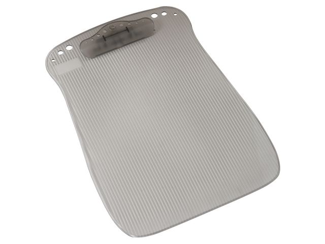 Skrivplatta i transparent svart plast med en stark pappersklämma.