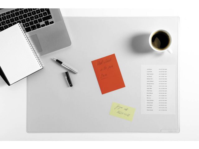 Det skrivvänliga underlägget skyddar, men döljer inte anteckningar, telefonlistor eller noteringar som förvaras under skrivunderlägget.