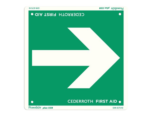 En dubbelsidig varselskylt med en riktningspil som används för vägledning till en Första hjälpen-station om olyckan är framme.