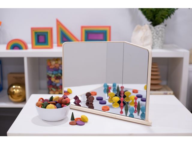 Fascinerande 90-graders hörnenhet där barnen kan se reflektioner inuti varje sida och basen, perfekt för användning i fantasifull lek, för att skapa små världsmiljöer, för att lära sig om reflektion och spegeleffekter, eller för att noggrant inspektera intressanta föremål. Den solida konstruktionen ger en stabil bas för de 2 mm akrylspeglarna, vilket gör bilden plattare och tydligare. Enheten levereras med gummifötter för stabilitet och för att skydda arbetsytor. Platt förpackad och redo för enkel montering av vuxen. Stödjer följande inlärningsområden: