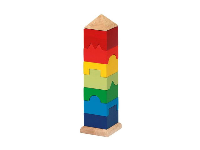 Stapeltorn i fina färger och olika former. Träleksak som stimulerar barnens fantasi och utvecklar koordinationsförmågan och finmotoriken.