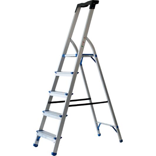 Praktisk hopfällbar aluminiumstege med fem steg samt en förvaringsbricka ovanpå.
