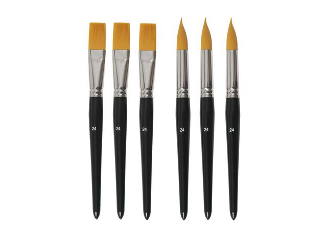 Låt kreativiteten flöda med hjälp av syntetiska penslar. I detta set får ingår både runda och flata penslar med nr 24. Så skapa både tunna och tjocka linjer, dramatiska konstverk och fina detaljer.