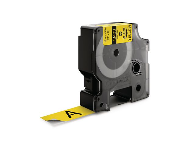 Vinyltejpkassetten DYMO® Rhino på 19 mm matar ut slitstark vinyltejp med svart text på vit botten för industrietiketter som ska hålla länge. Perfekt för kablar och sladdar. Texten på Rhino-etiketter skrivs ut med termisk överföringsteknik – varken bläck eller toner behövs. De är resistenta mot vatten, UV-ljus, kemikalier och olja, och har en stark vidhäftning som är perfekt för industriell användning. Dra av etikettens skyddsfilm för enkel applicering.