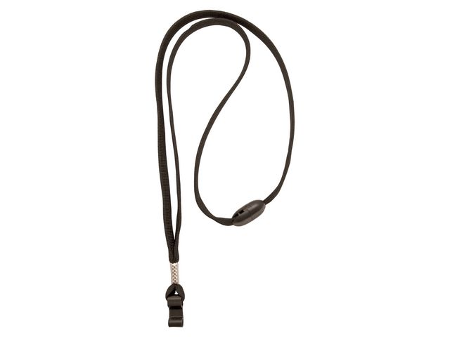 Band med plastkrok samt säkerhetsknäppe. Lämplig för korthållare.