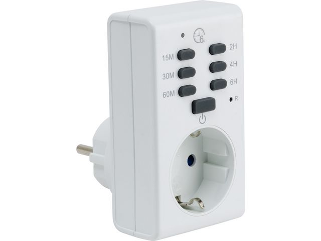 Lättanvänd timer där program ställs in genom att trycka på respektive knapp, från 15 min till 6 tim. Slår av kaffebryggaren, strykjärnet o s v efter inställd tid.