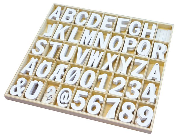 Vita bokstäver, siffror och specialtecken förvarade i en praktisk låda som innehåller fem stycken av varje sort. Gör en namnskylt till husdjuret eller ett fint grattiskort. Ett perfekt kit för alla som övar på att stava och läsa.