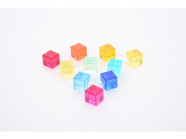 Tillverkade av solid akryl och vackert avslutade med släta kanter. Kuberna är mycket tilltalande att hantera, de låter underbart när de rullas tillsammans och kommer att fånga ljuset för att visa de interna reflektionerna på ett fascinerande sätt. En härlig startuppsättning för att lära sig om färger och färgblandning, för att stapla och balansera, och för att använda i små världar. Stödjer följande inlärningsområden: