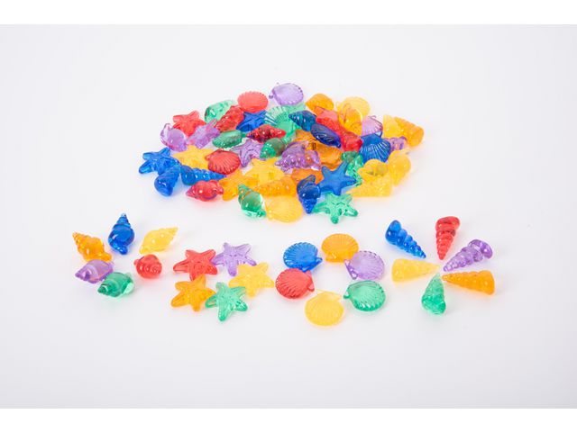 De genomskinliga färgerna gör dem perfekta för användning på en ljuspanel och de detaljerade funktionerna ger ett taktilt inslag till setet. Inkluderar 4 olika former (sjöstjärna, spiral, mussla och snäcka) i 6 färger (röd, orange, gul, grön, blå och lila) i en praktisk förvaringsburk med lock. Stödjer följande lärandeområden: