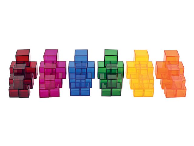 Transparenta byggkuber i tre olika storlekar som är lätthanterliga och gör byggupplevelsen rolig samtidigt som de främjar barnens motoriska färdigheter.