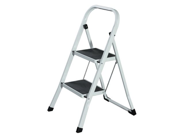 En 2-stegs trappstege i stål med brett steg (380x260mm) samt räcke. Anti-slip gummifötter så att stegen står säkert och fast. Kan användas för kontor och hemmabruk.