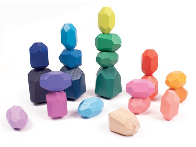 21 st kantiga oval-formade trästenar i olika storlekar och färger som inbjuder till öppen lek.