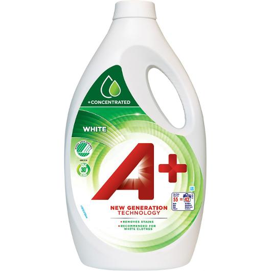 A+ White flytande tvättmedel är med sin innovativa formula perfekt för fläckborttagning och tvätt i vardagen. A+ tvättar strålande rent varje gång och ger ett perfekt resultat även vid låga temperaturer. A+ White är Svanenmärkt och framtagen speciellt för tvätt av vita kläder, så att vitheten bevaras. Produkten innehåller inget blekmedel och är effektiv redan vid 30 grader. Dosera rätt i förhållande till nedsmutsning och vattenhårdhet. Flaskan är gjord av 99% återvunnen plast och är 100% återvinningsbar.