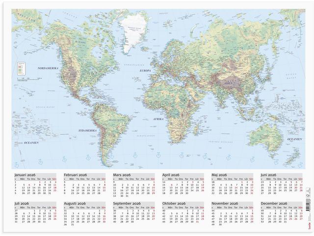 Årsöversikt och världskarta med tidszoner. Skala 1:50 000 000.