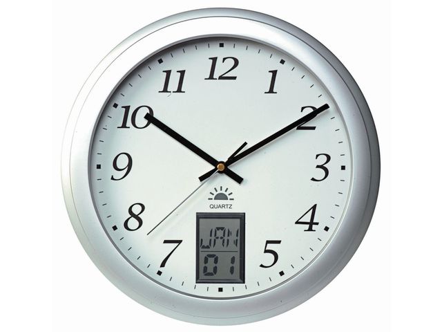 Precision och elegans. Unilux väggur Instinct med LCD-display för visning av timmar och minuter, dag och datum eller datum och månad.