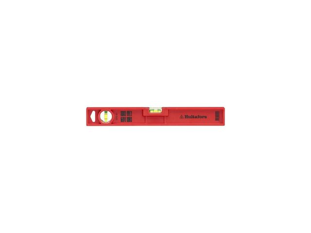 Ett slagtåligt vattenpass i röd polystyrenplast som tål temperaturer mellan –15°C och +60°C. Våglibell med förstoringsglas och självlysande reflektor.