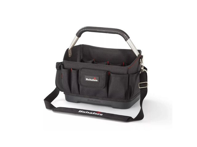 En öppen verktygsväska i textil, designad för ergonomiskt bärande.
