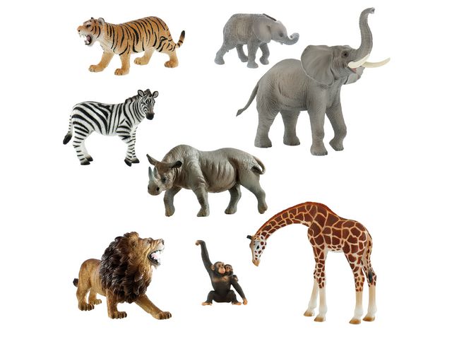 Vilda djur från Afrika i ett lekfullt set, åtta stycken handmålade och PVC-fria figurer. Lek med giraffen, apan, lejonet, zebran, tigern, noshörningen och elefanten med sin elefantunge. Låt djuren få följa med på spännande äventyr, att leka utvecklar barns fantasi och deras motoriska färdigheter. Djuren kan även användas i lekhus. Notera att innehållet kan variera.