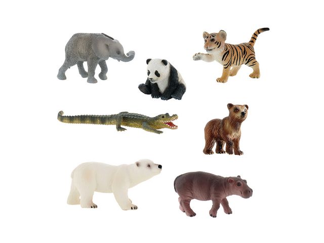 Ett set med sju stycken djurungar från det vilda. Lek med elefanten, tigern, pandan, krokodilen, isbjörnen, flodhästen och björnen och låt dom följa med ut på äventyr. Alla figurer är handmålade och fria från PVC. Notera att innehållet kan variera.