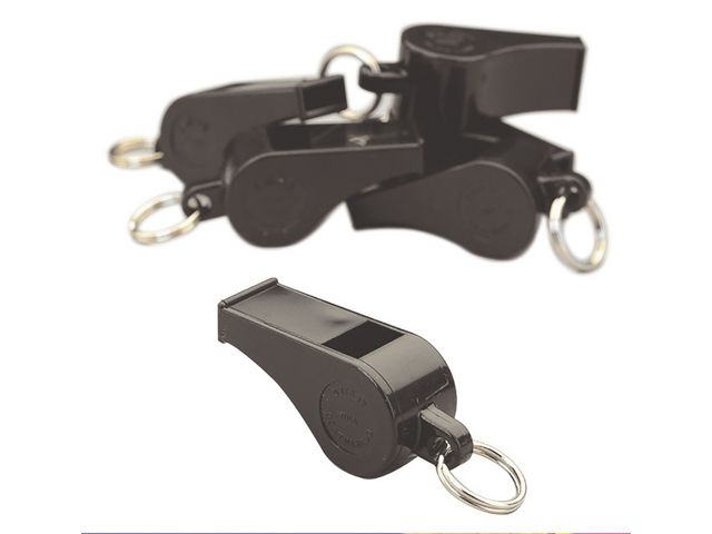 Vanliga visselpipor av svart plast som är lämpliga för sportaktiviteter, träningspass och fester.